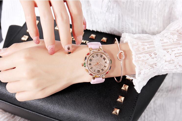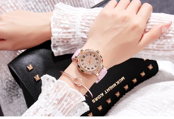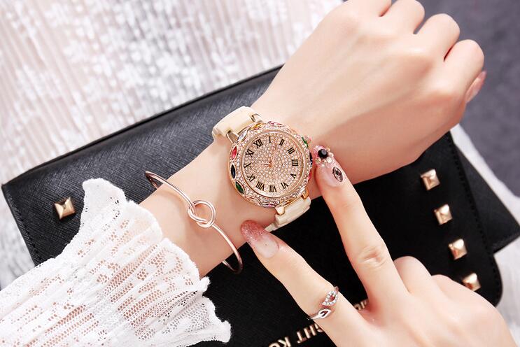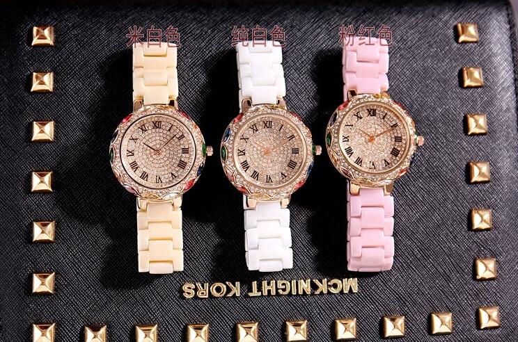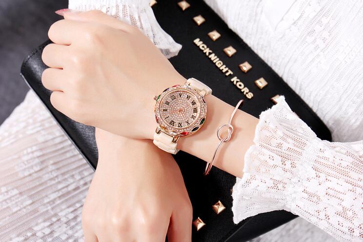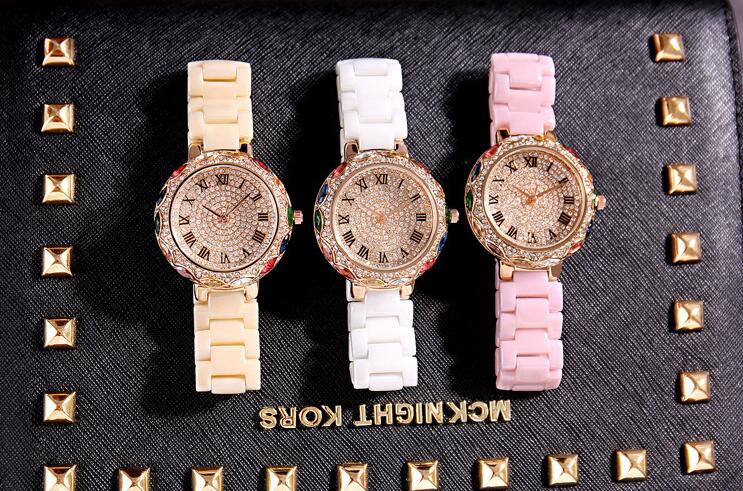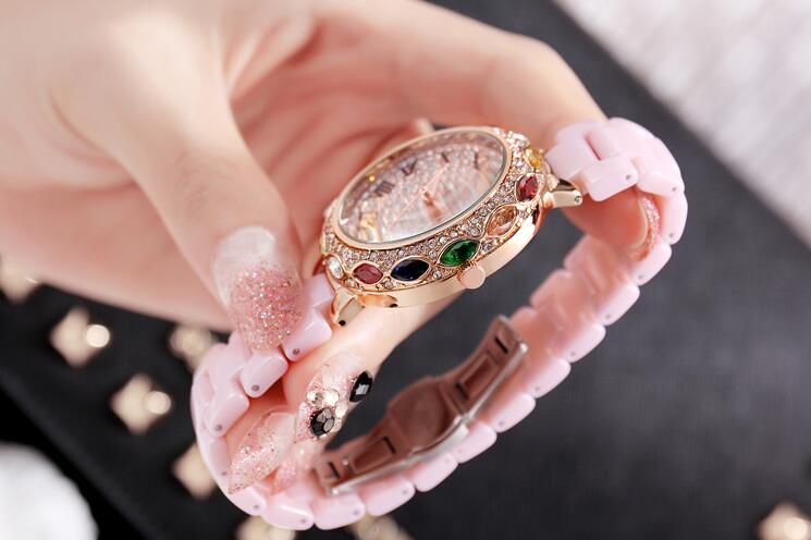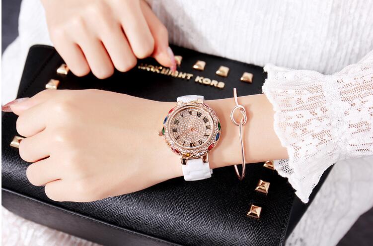 新款 陶瓷錶帶女士時尚耐用奢侈 七彩滿鑽 個性手錶Wat64