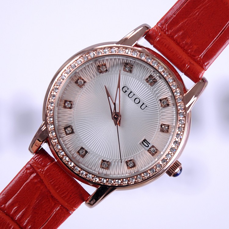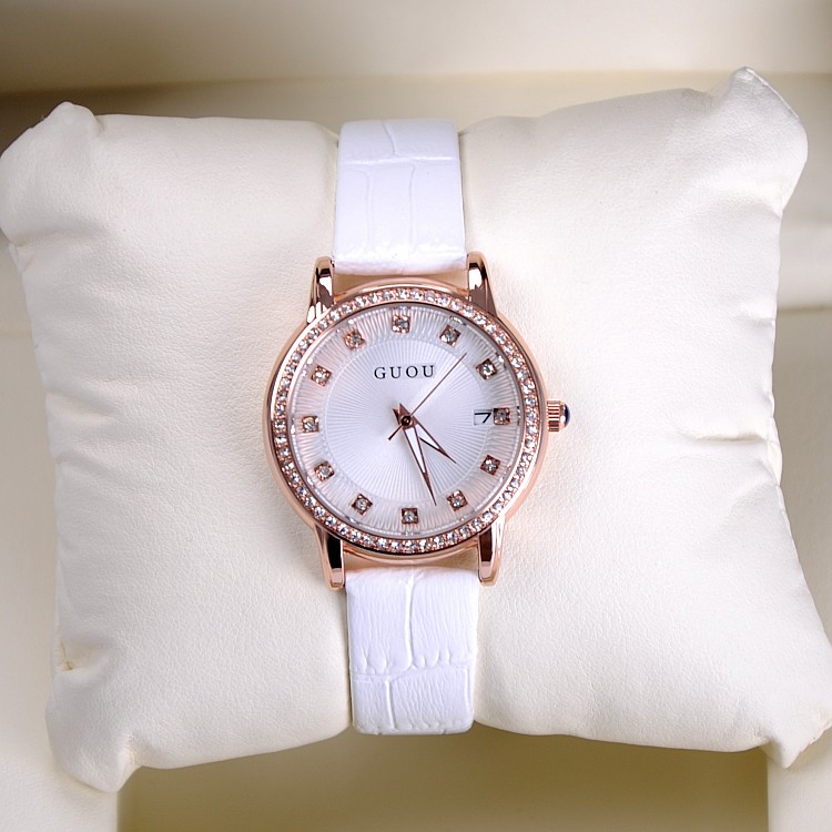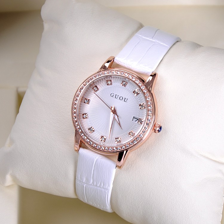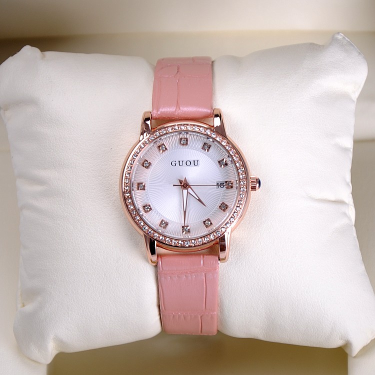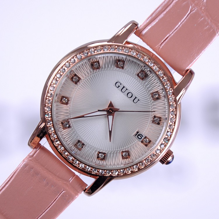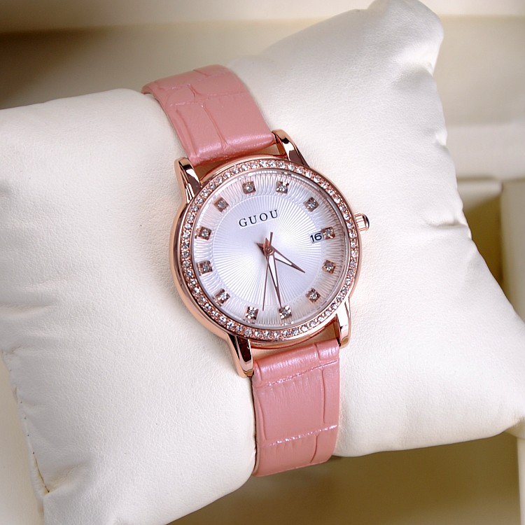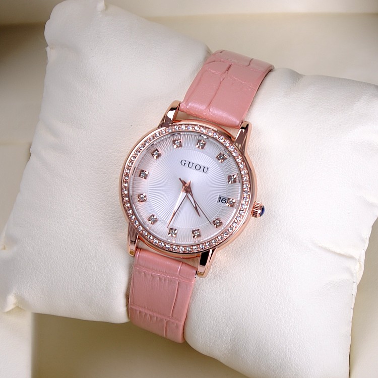 耐用皮帶手錶女時裝鑲鑽日曆手錶Wat67