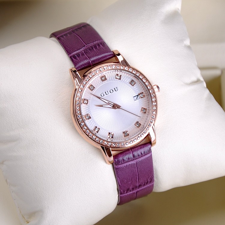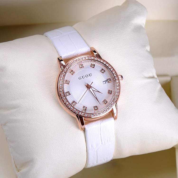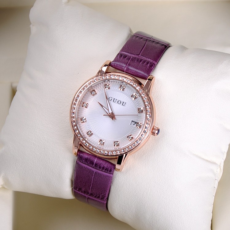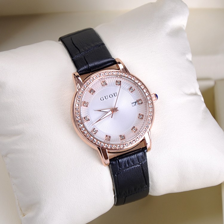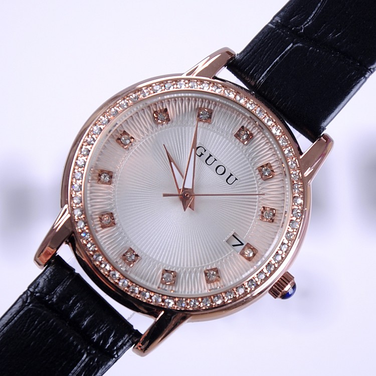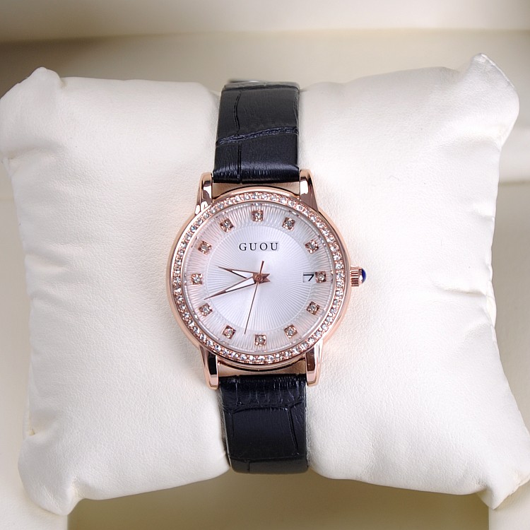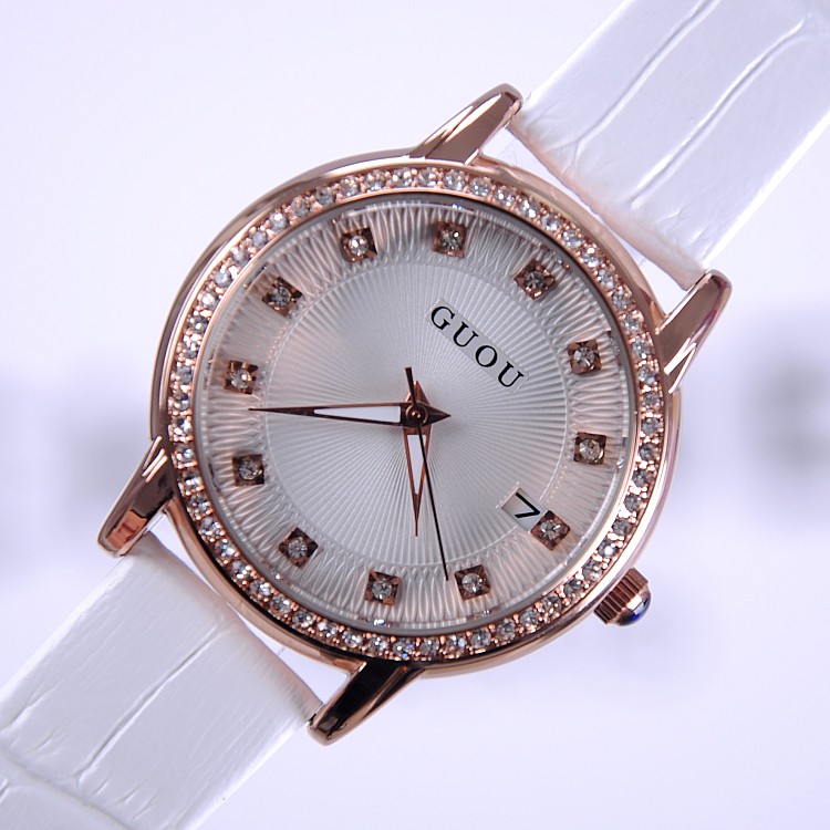 耐用皮帶手錶女時裝鑲鑽日曆手錶Wat67