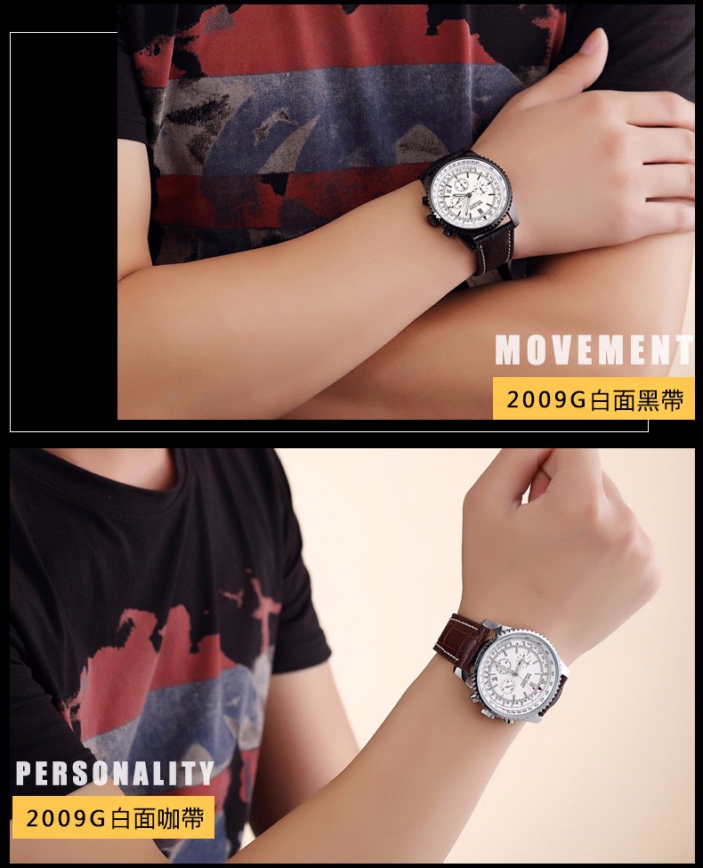 石英日曆腕表真皮男士六針運動防水錶Wat29