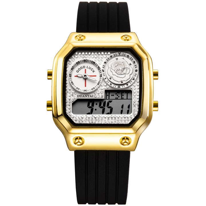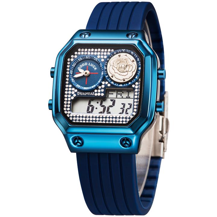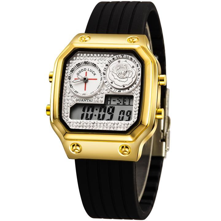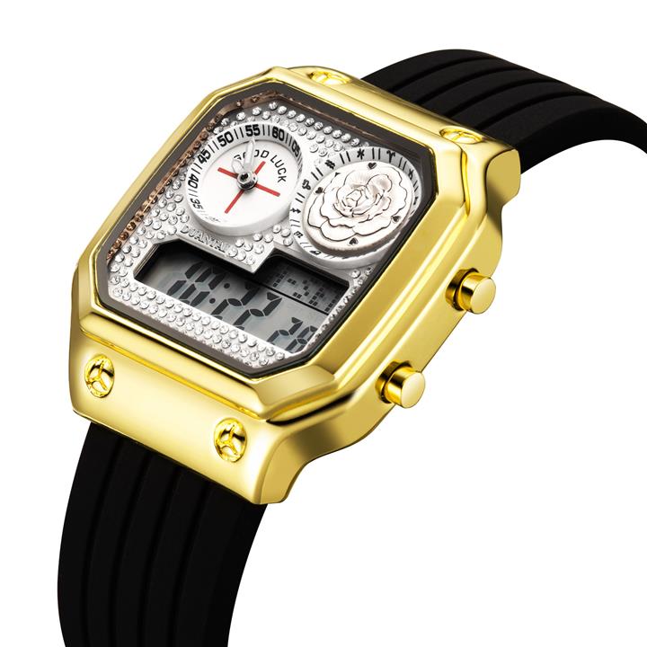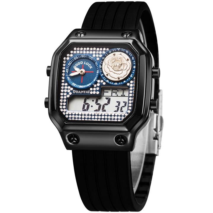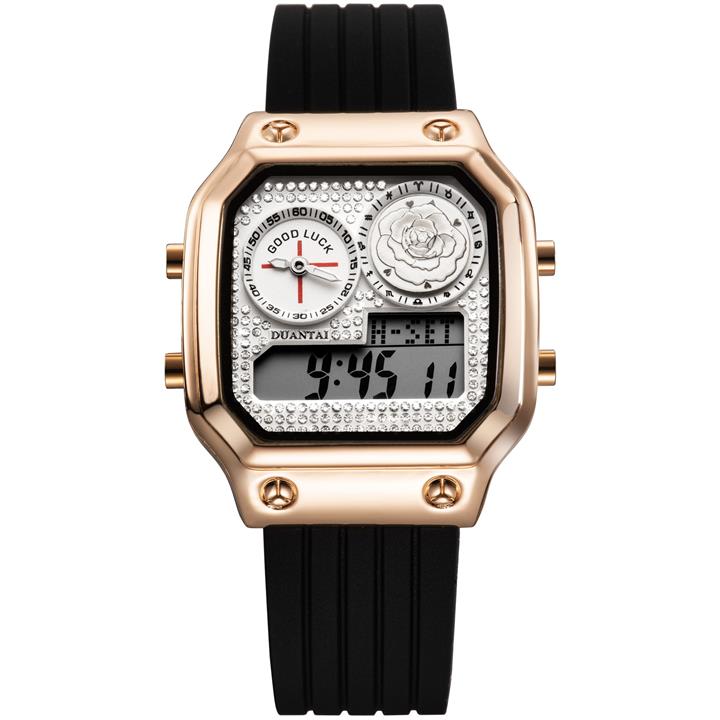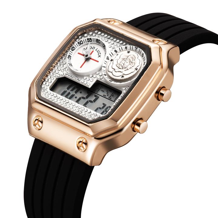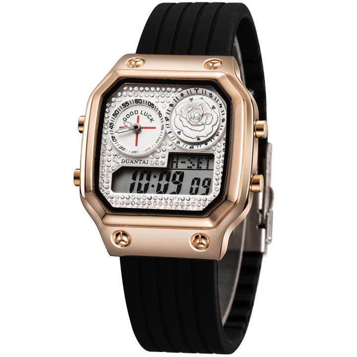 多功能雙機芯鑲鑽錶盤女款玫瑰矽膠錶帶夜光手錶 Wat1864
