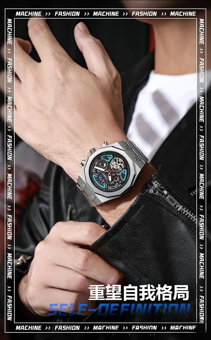 富西尼Forsining正品男士全自動機械錶帶鑽鏤空防水鋼帶款男錶wat1130