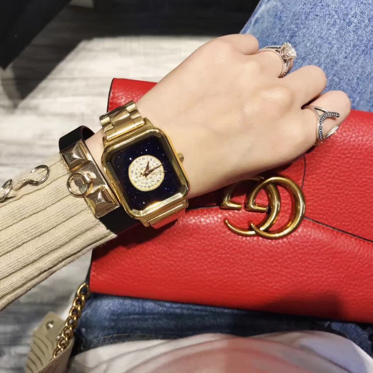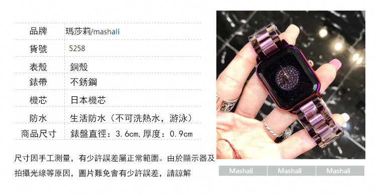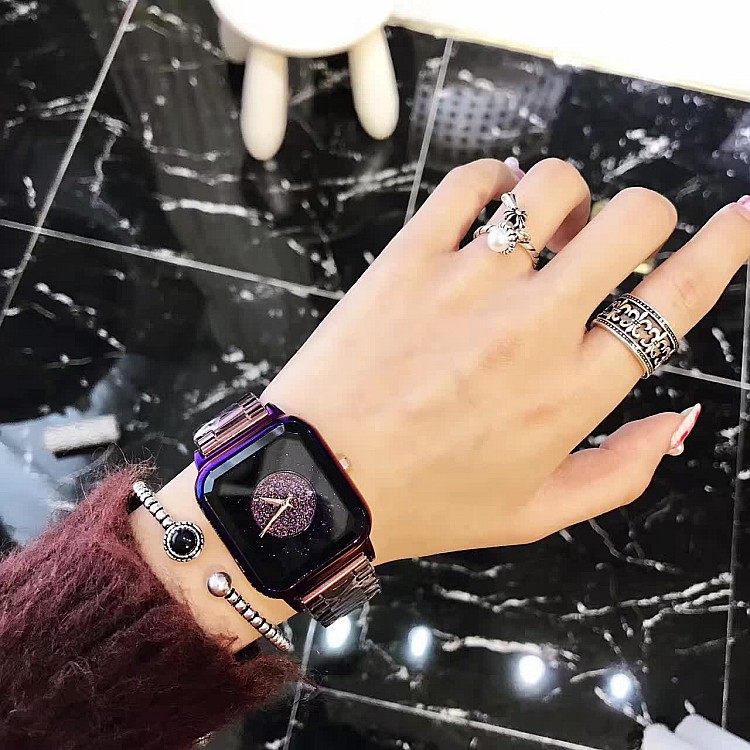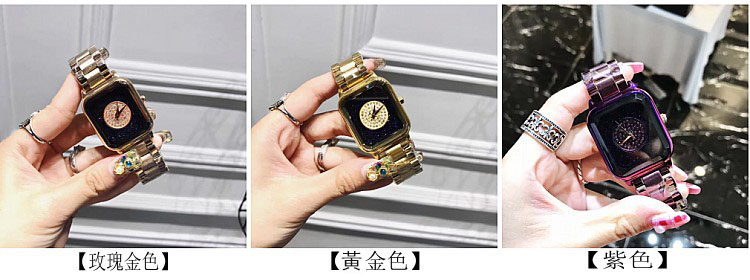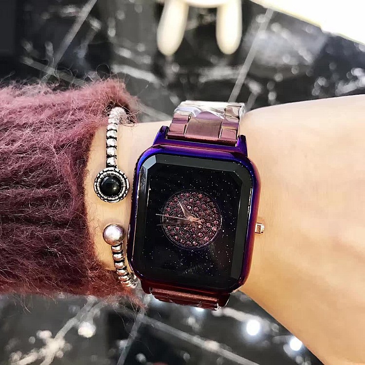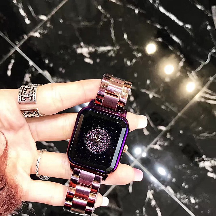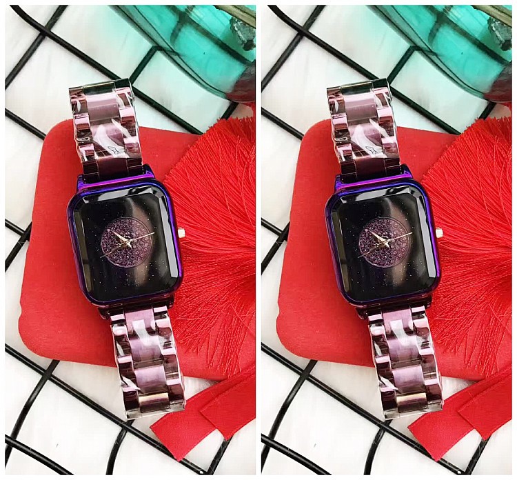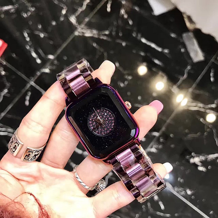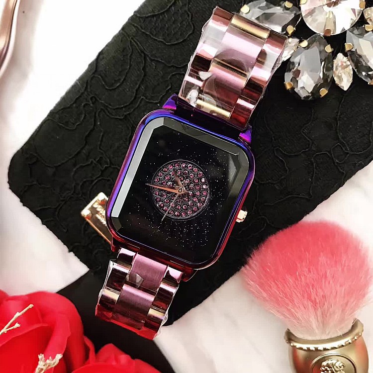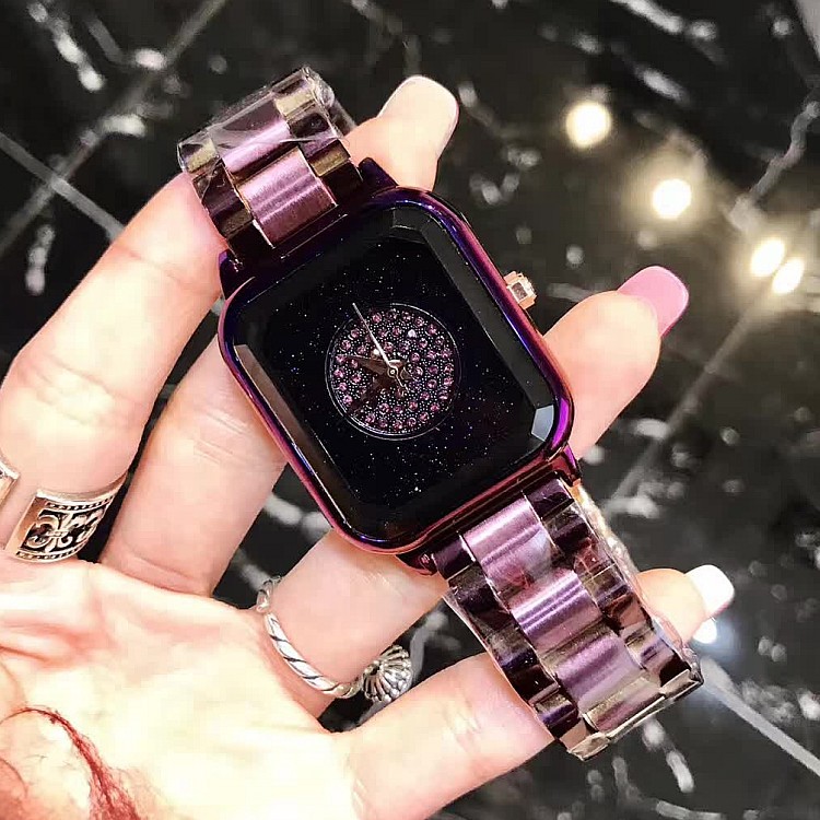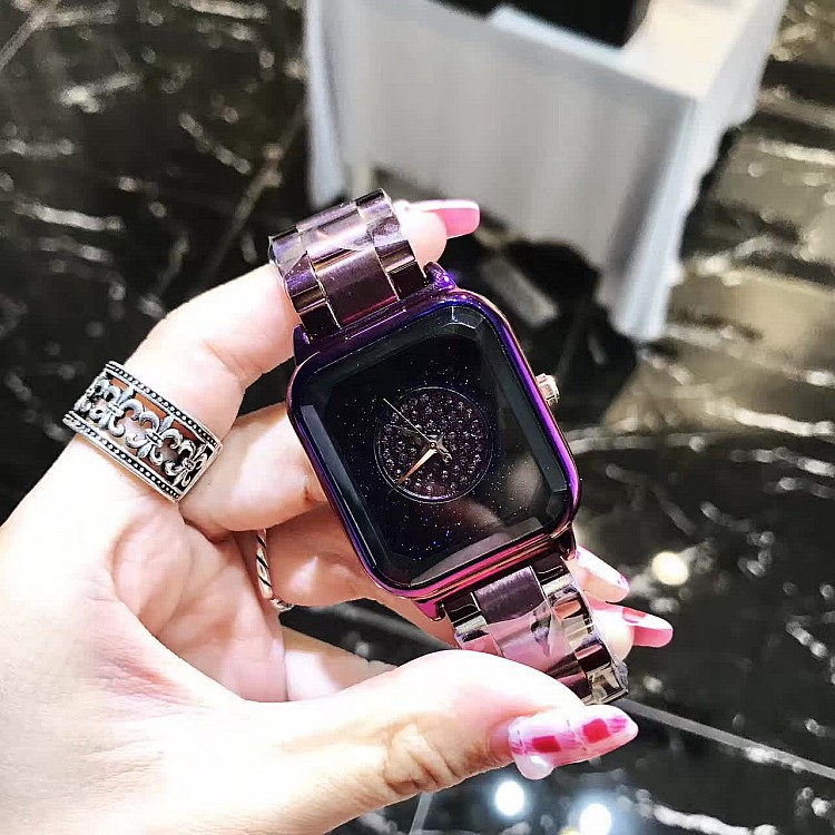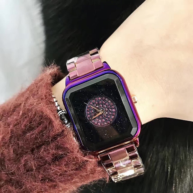 潮流個性方形時尚 星空面鑲鑽 紫色殼不銹鋼錶帶女士手錶Wat57