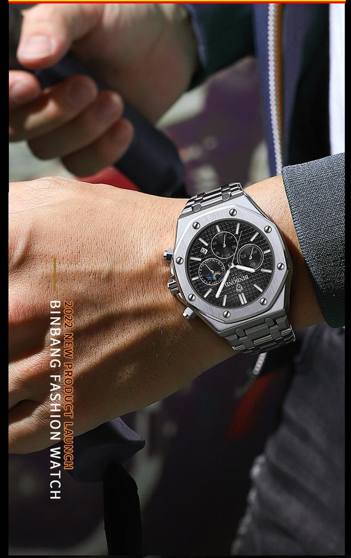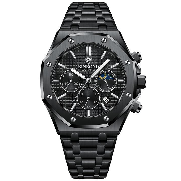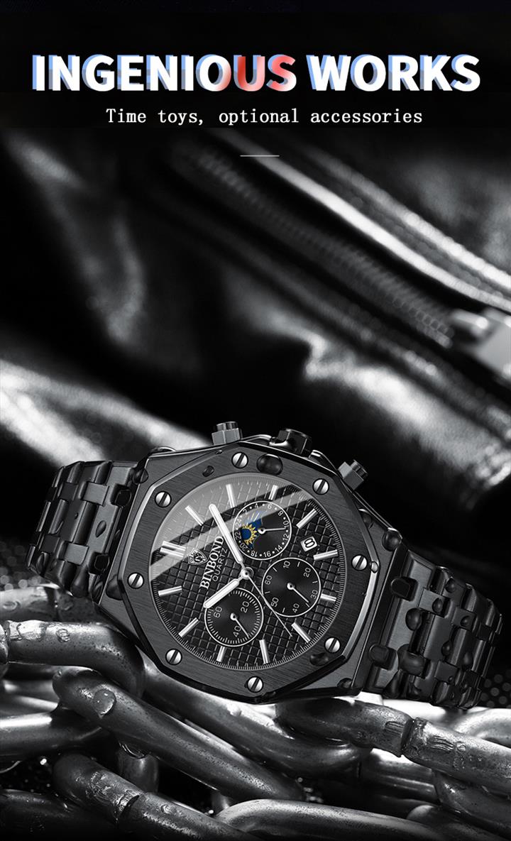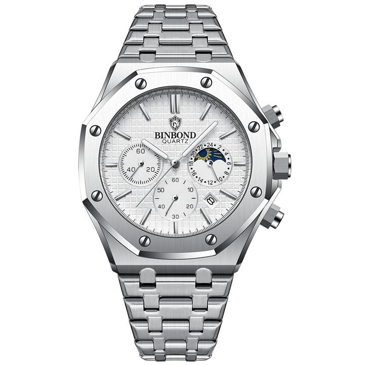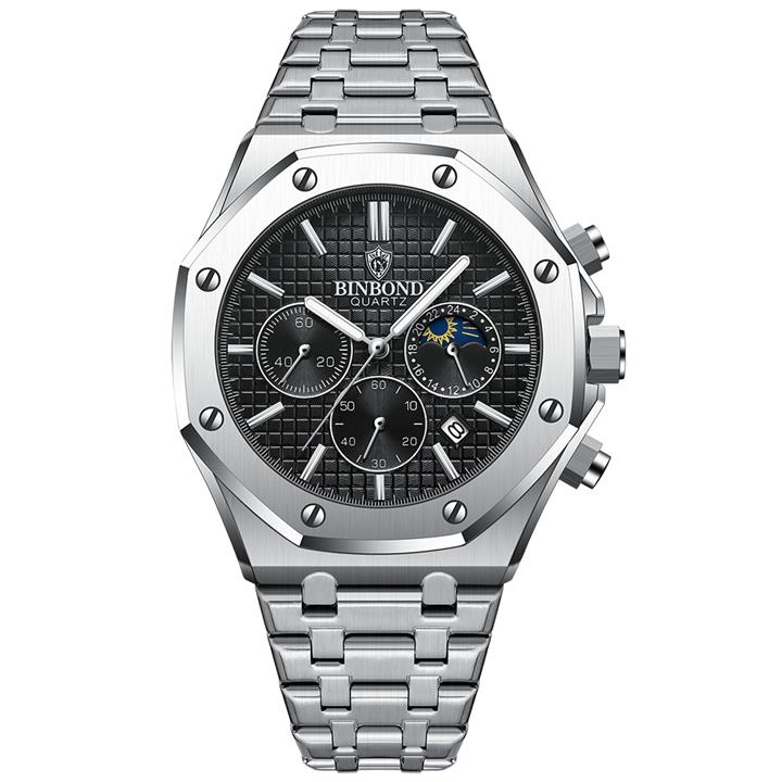 高檔三眼六針多功能月相鋼帶表Wat2042