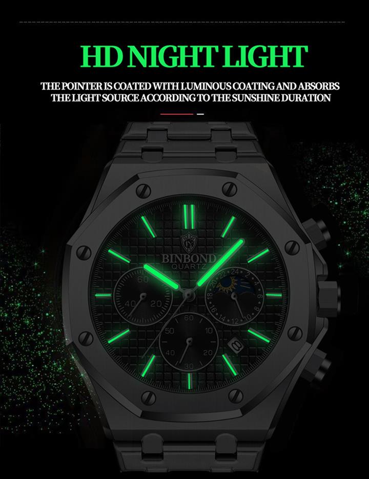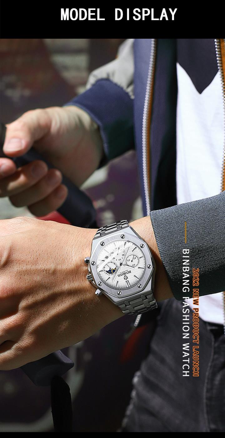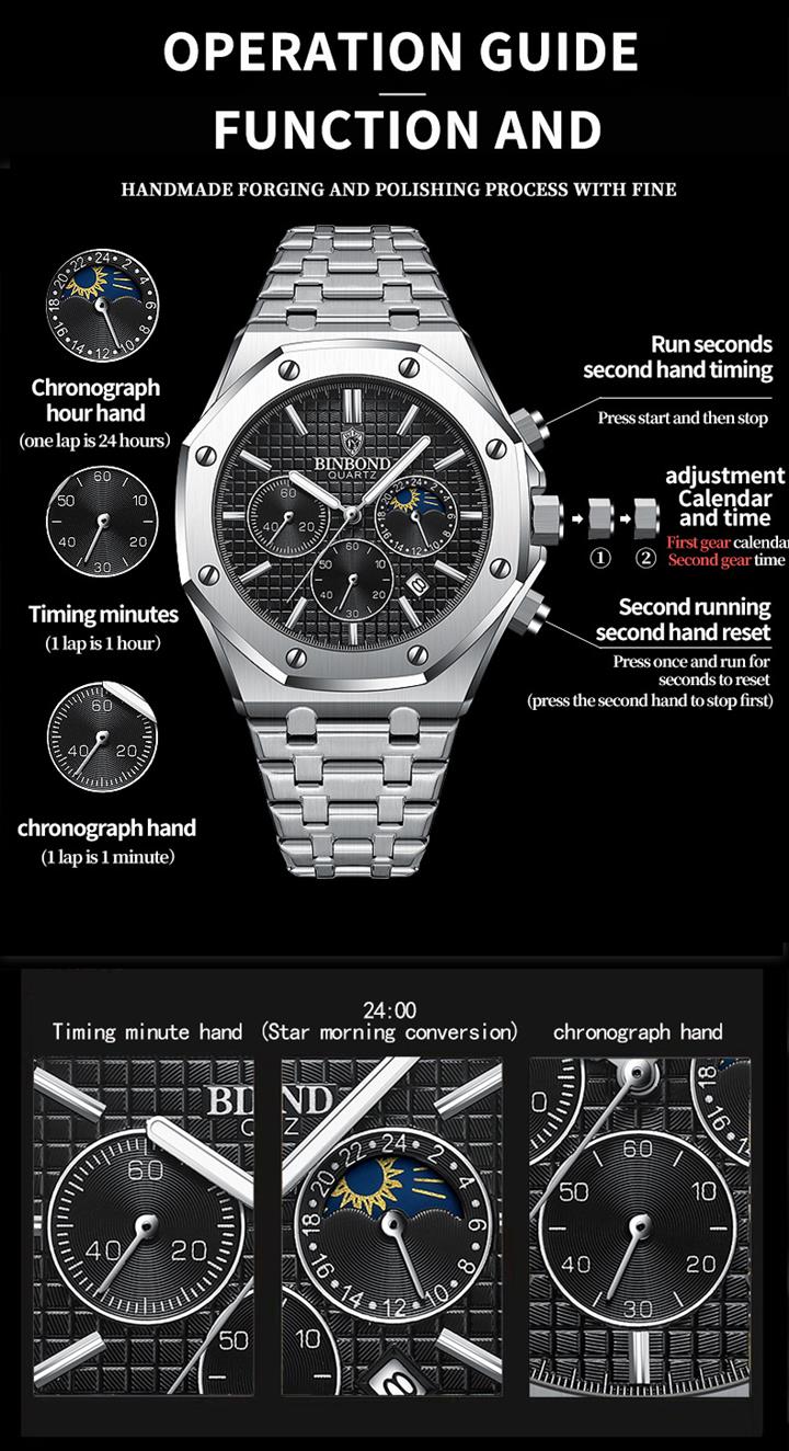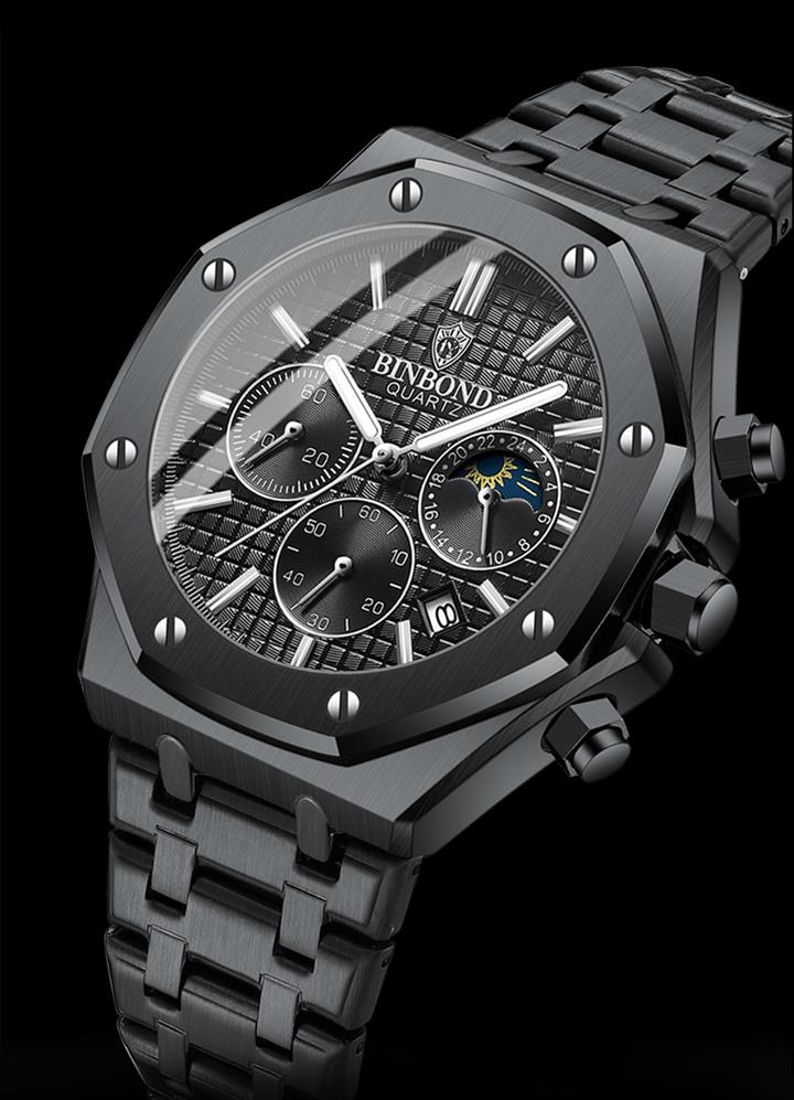 高檔三眼六針多功能月相鋼帶表Wat2042