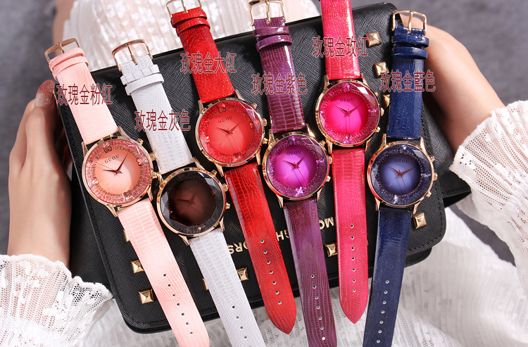 耐用大牌奢華時尚帥氣大錶盤水鑽表紅色紫色皮錶帶女士手錶Wat49