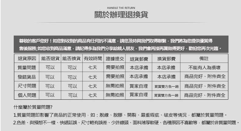 至收到商品之日起7天內,向售後服務中心發送郵件至Twservicecenter@yahoo.com,客服會在收到郵件后的1-3個工作日內受理您的請求,退換貨所產生的運費由我方承擔。
