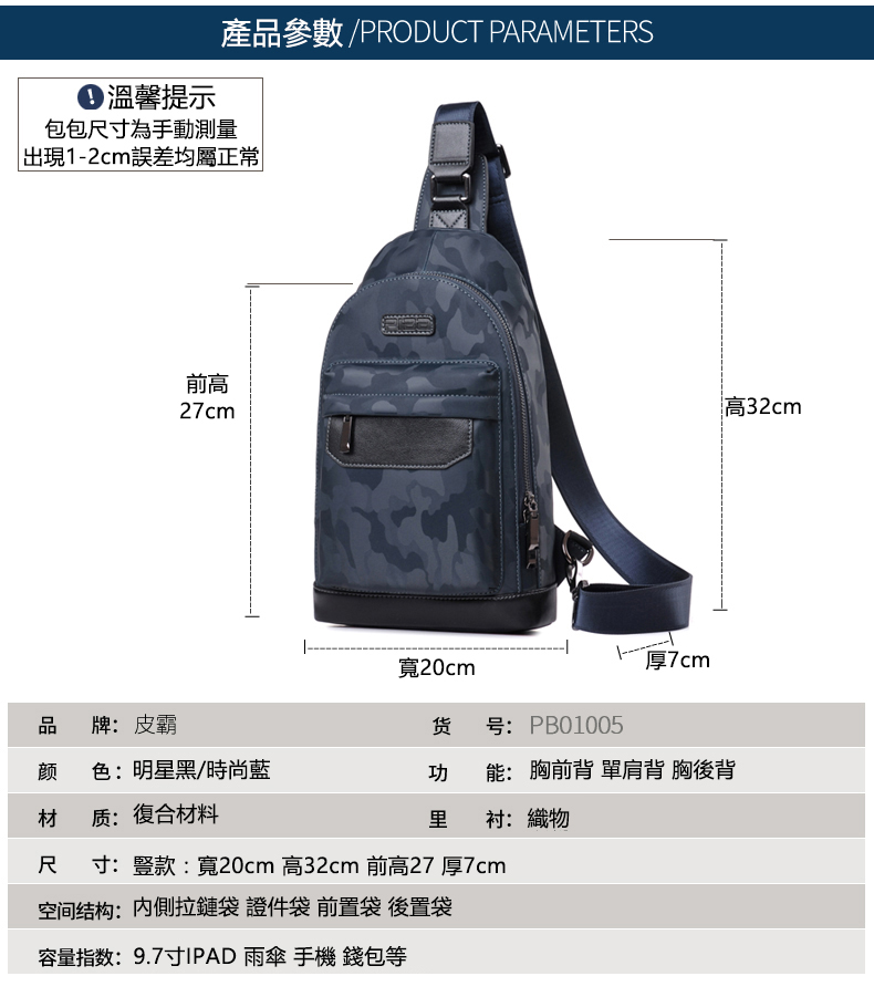 皮霸時尚胸包男士單肩包韓版迷彩休閒包Piba01