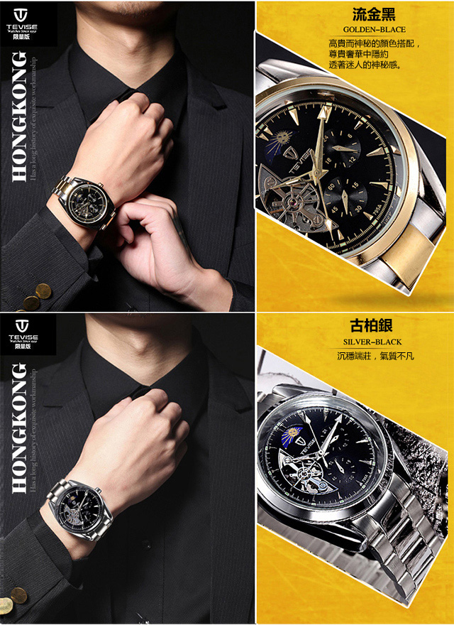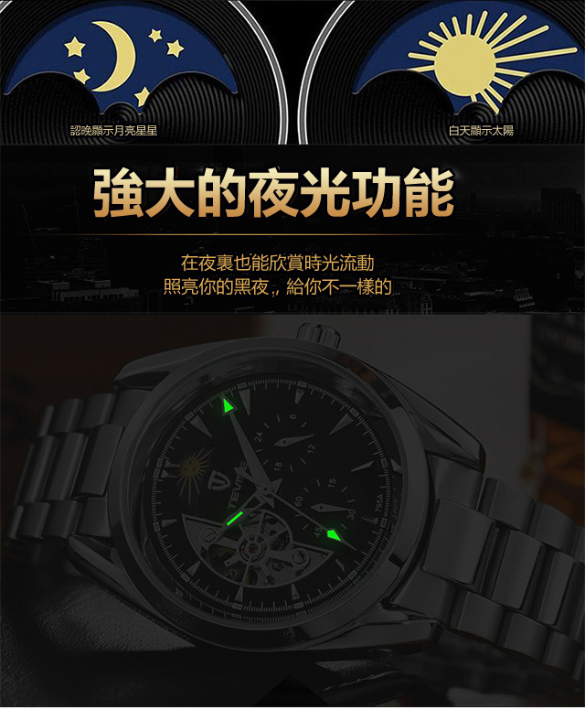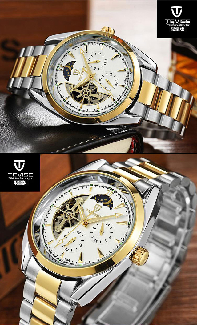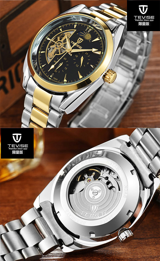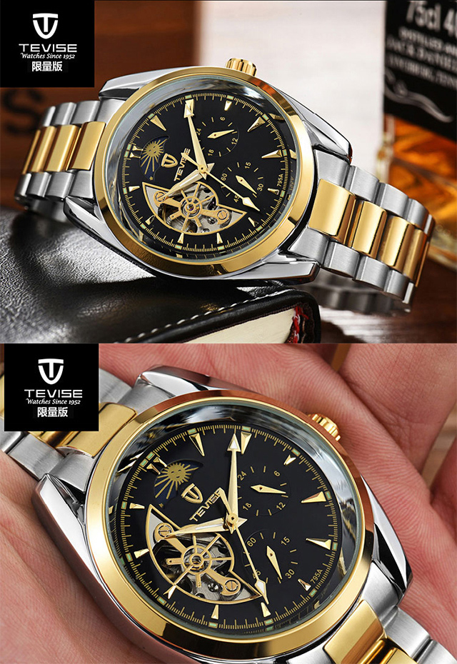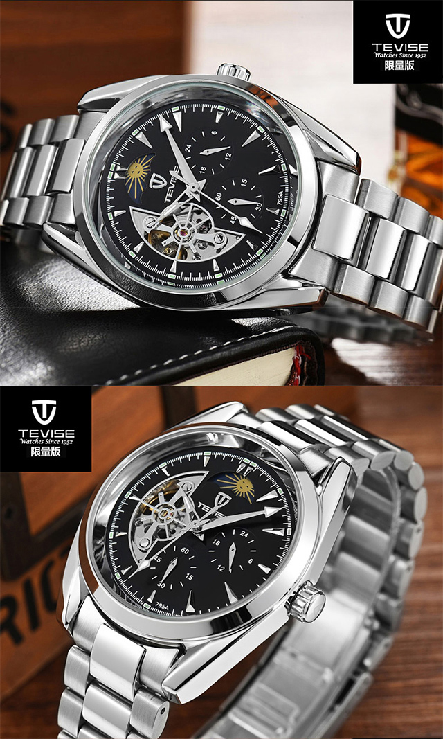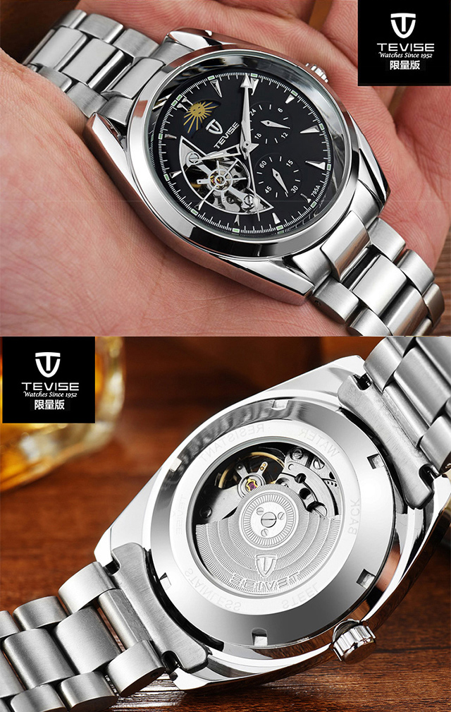 TEVISE全自動機械表鏤空精鋼商務男錶Wat04