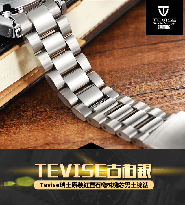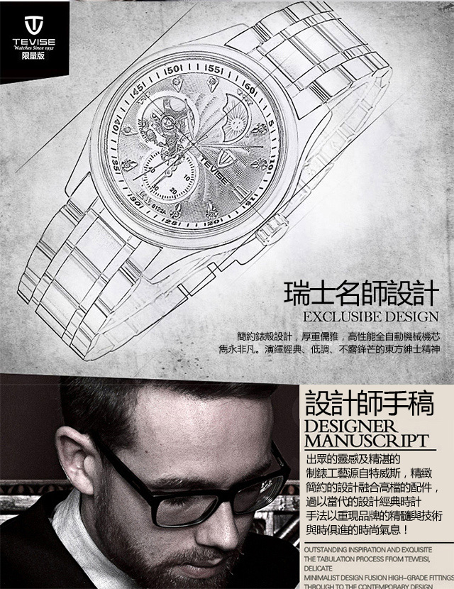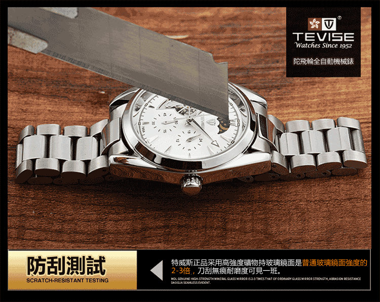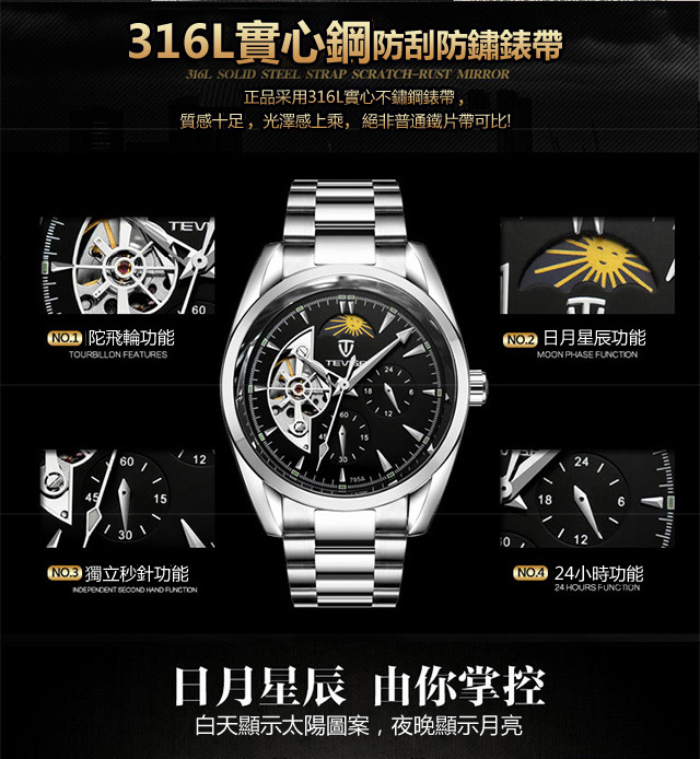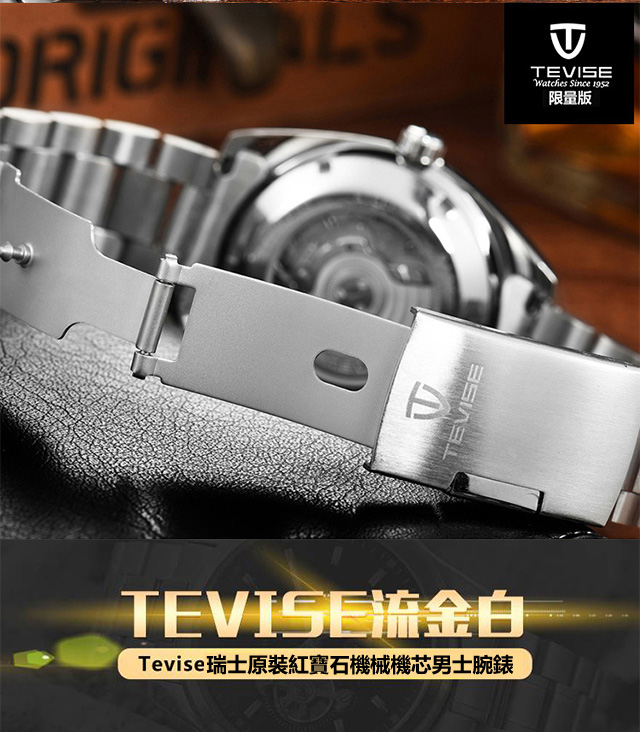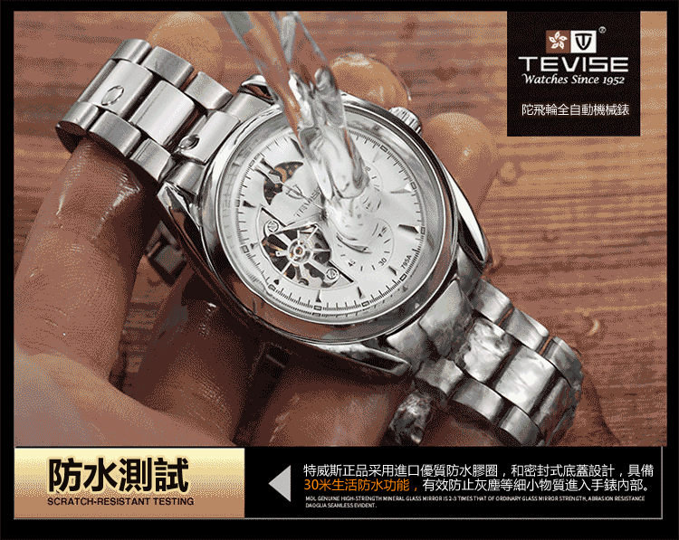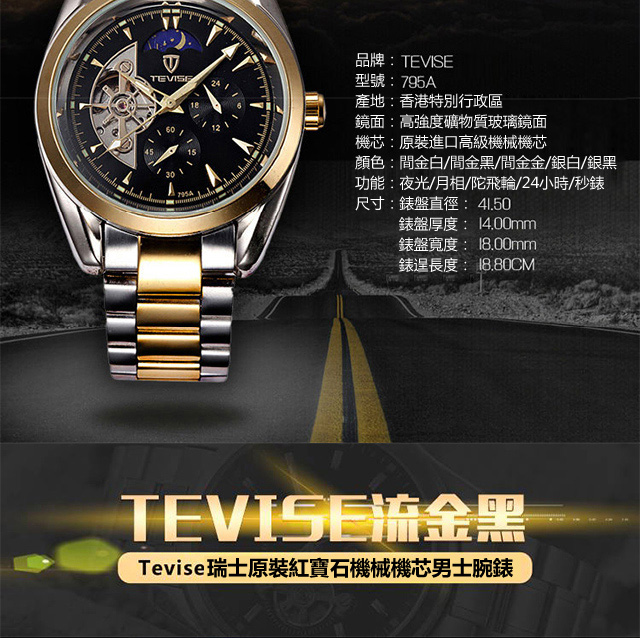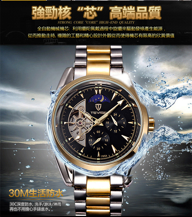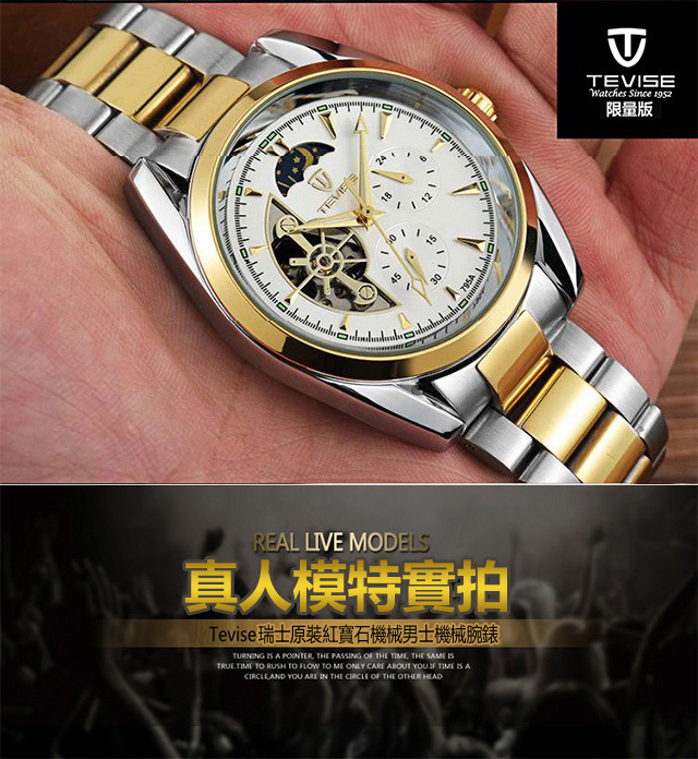 TEVISE全自動機械表鏤空精鋼商務男錶Wat04