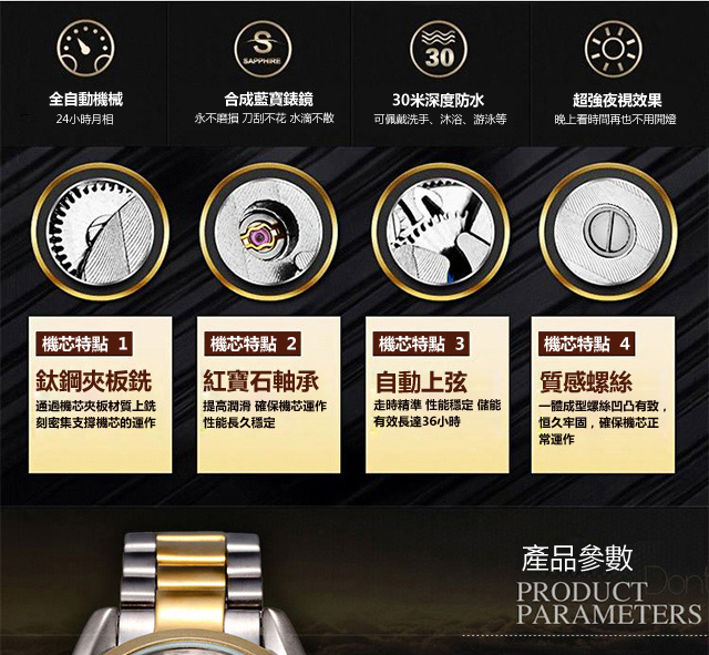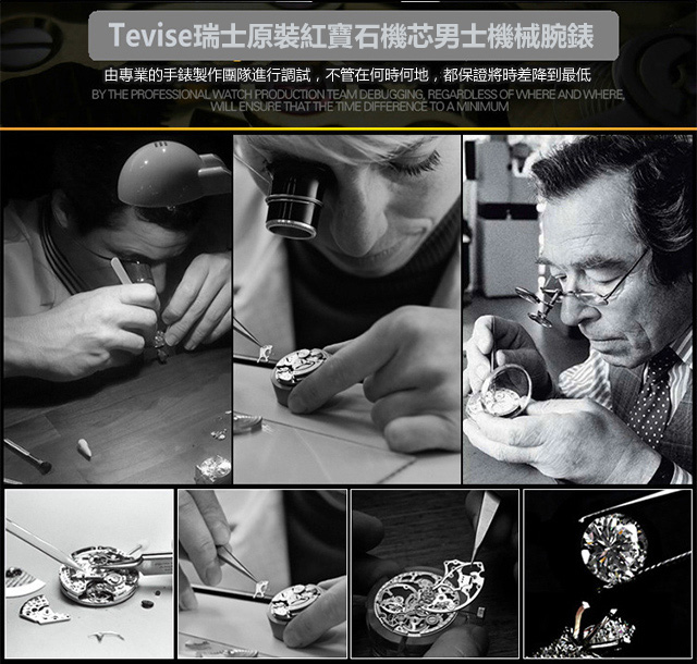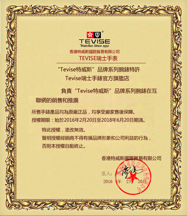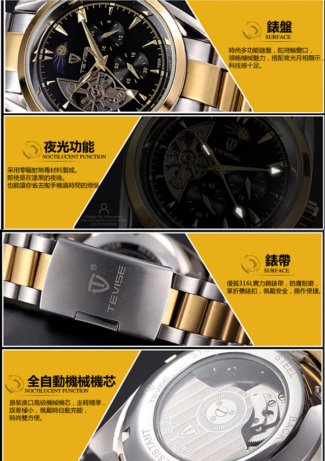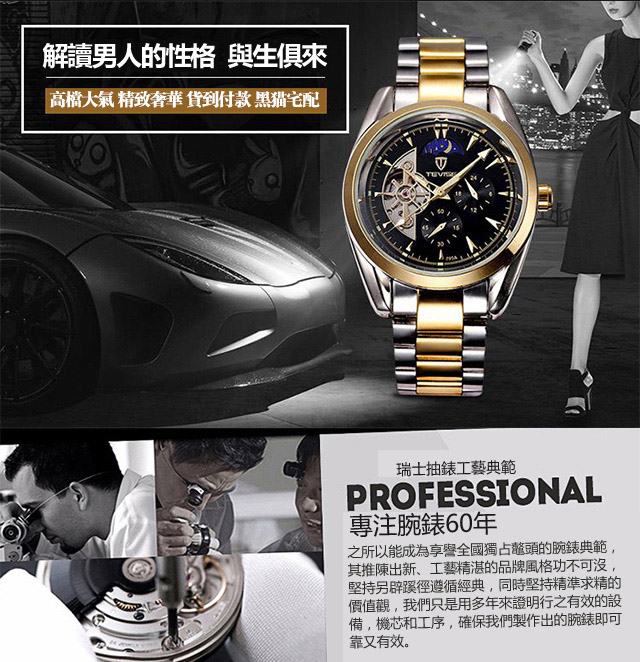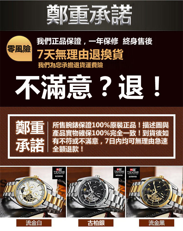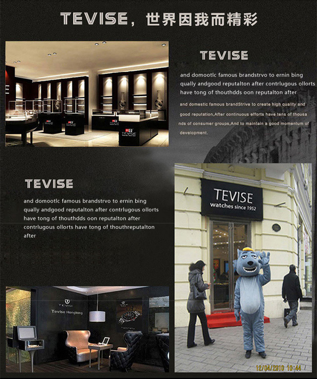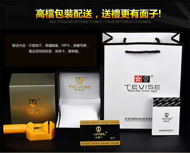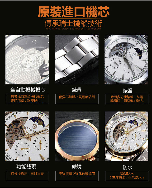 TEVISE全自動機械表鏤空精鋼商務男錶Wat04