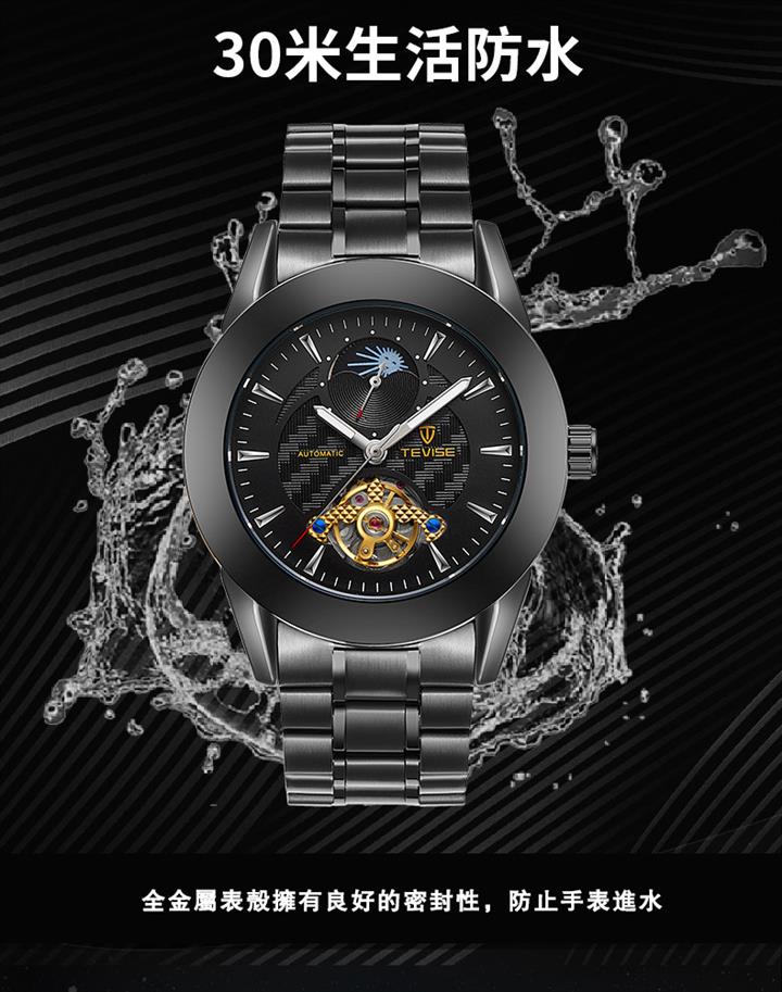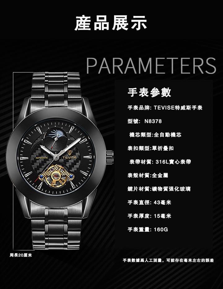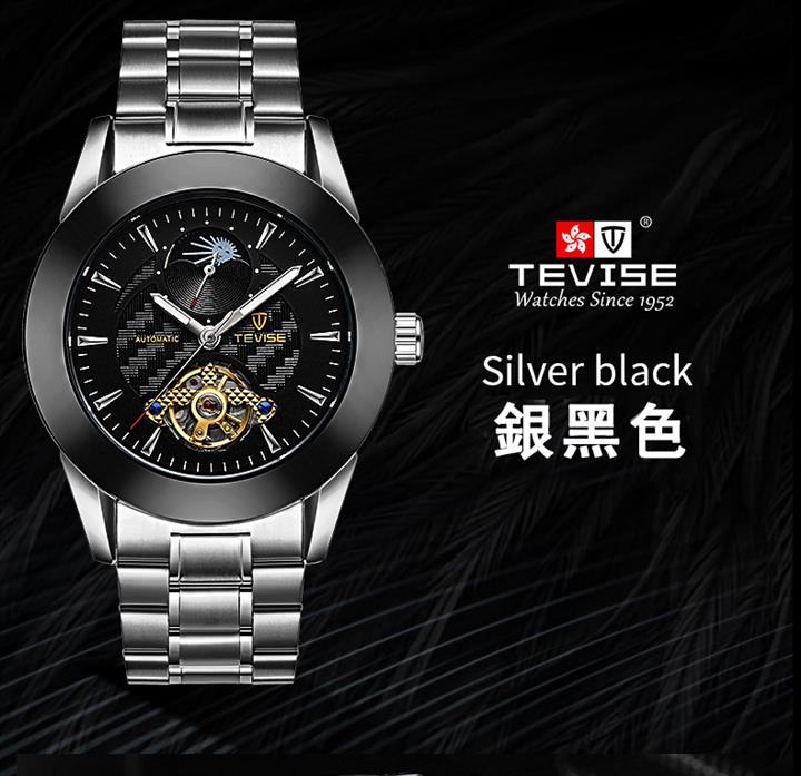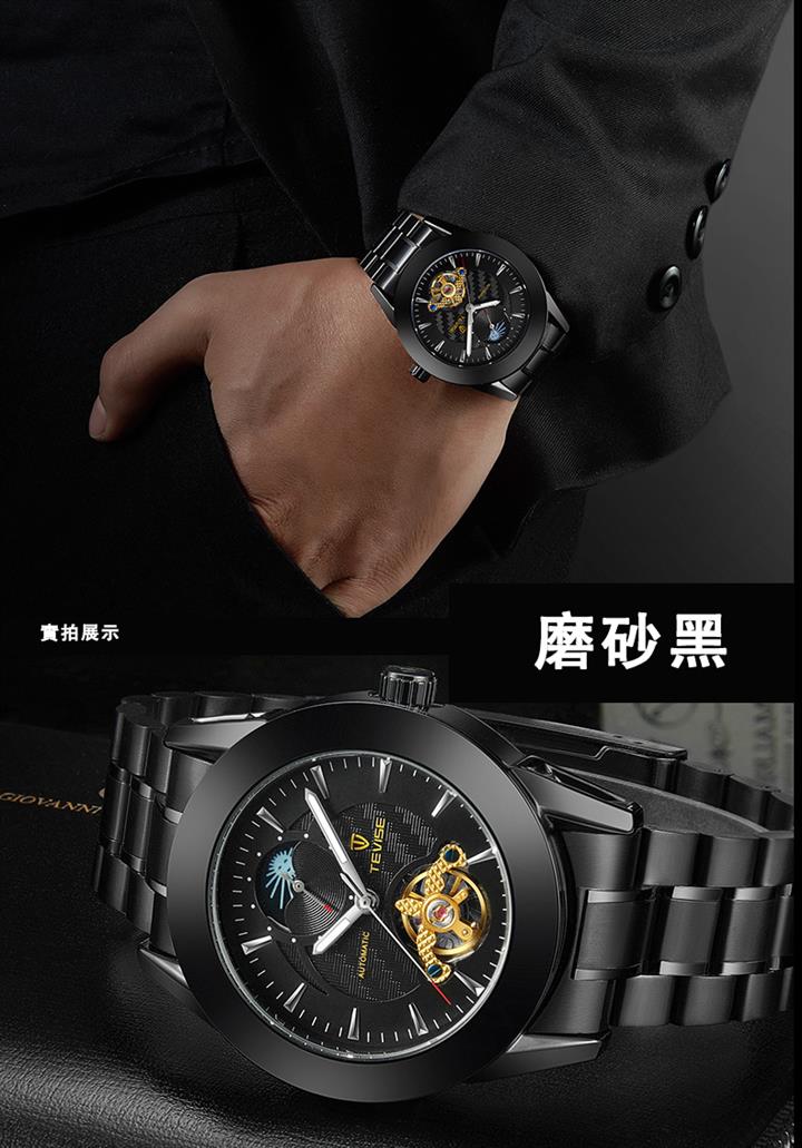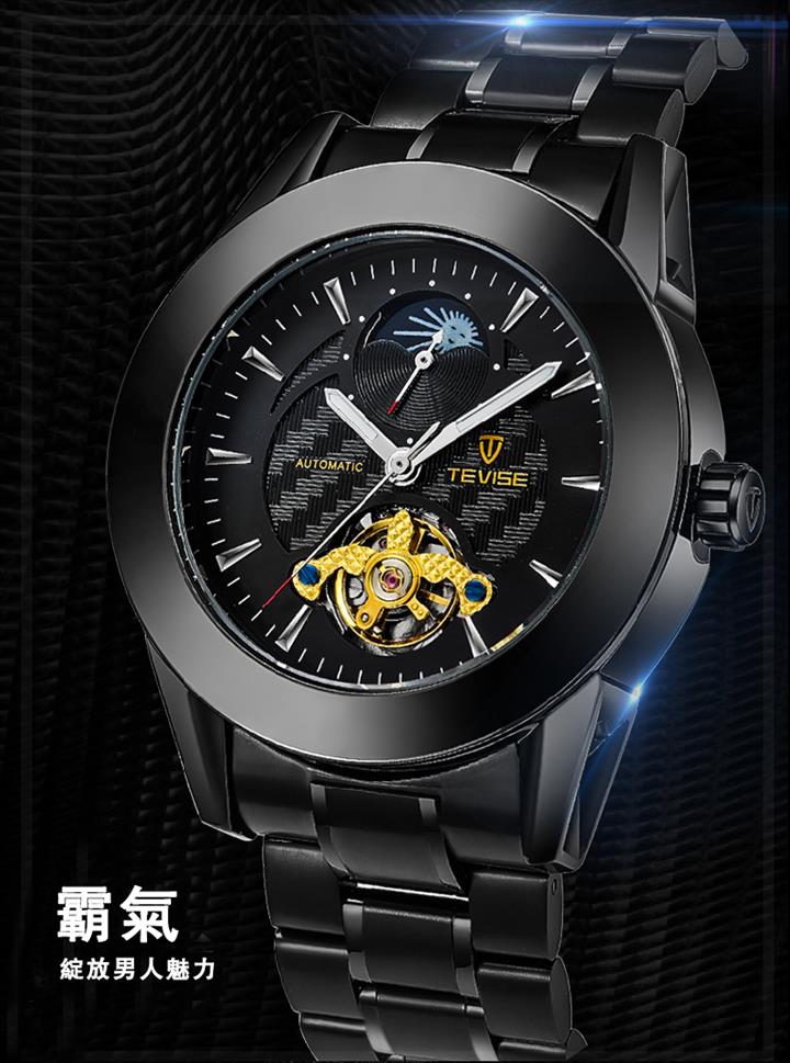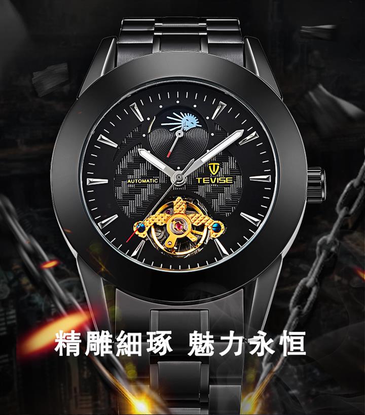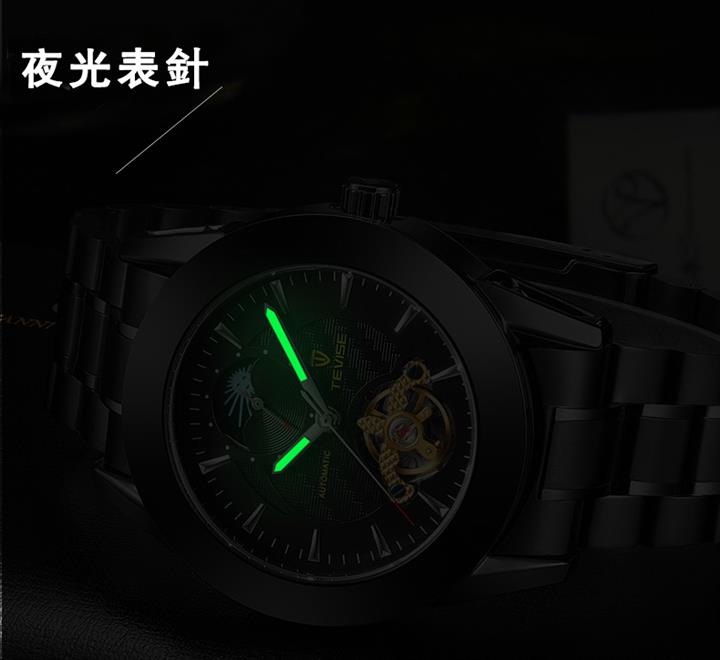 TEVISE全自動機械表鏤空精鋼商務男錶Wat04