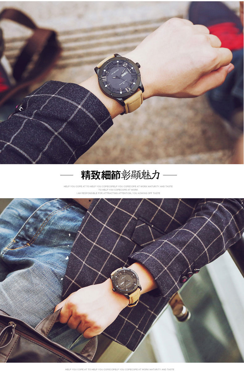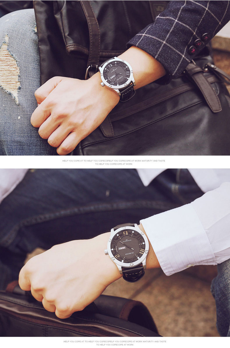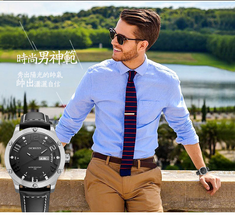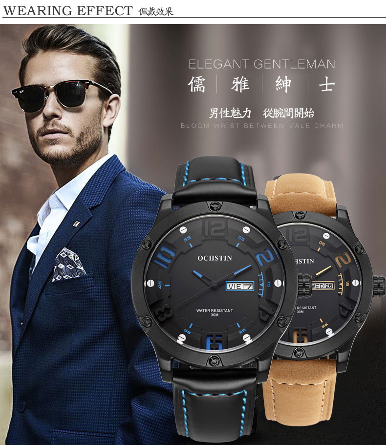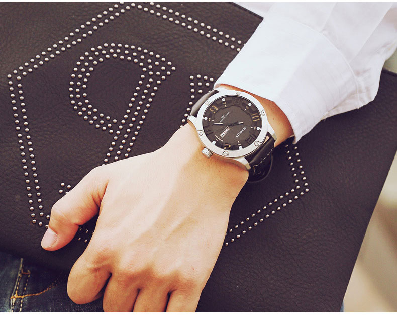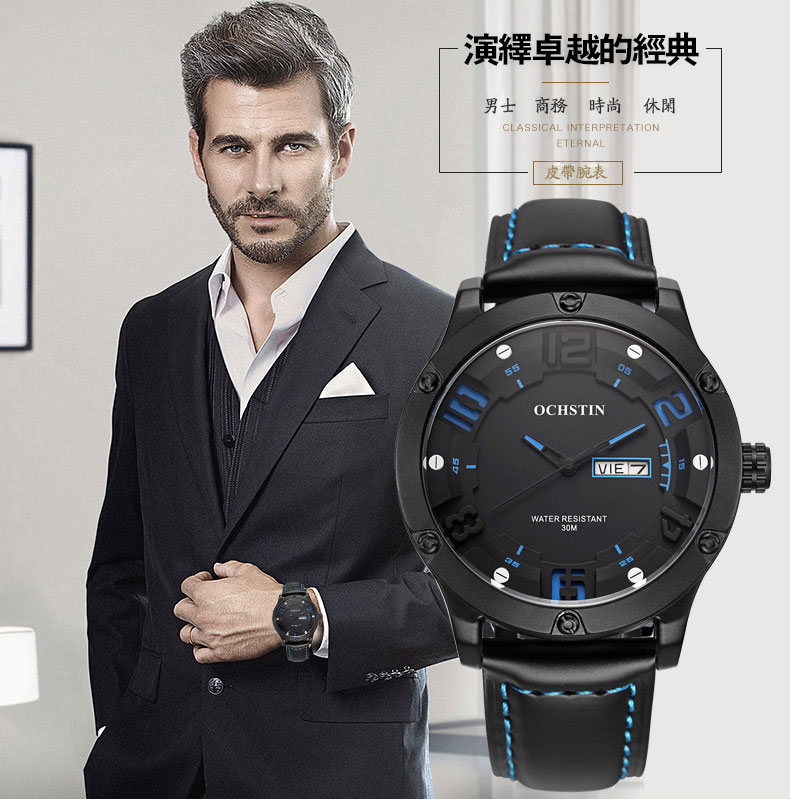 雙日曆流行石英腕表男士運動防水錶Wat30