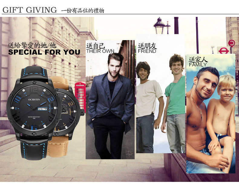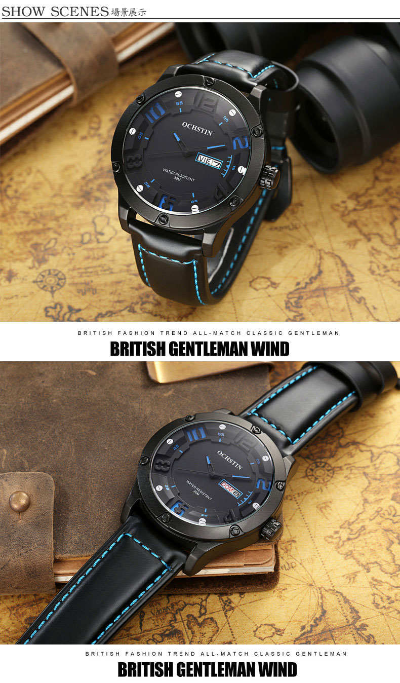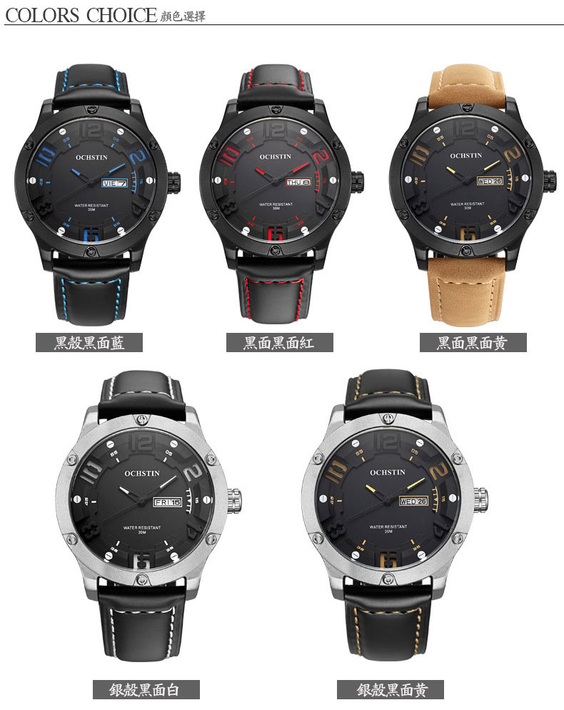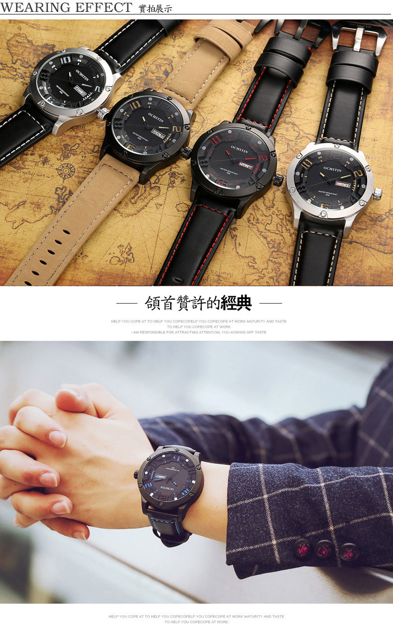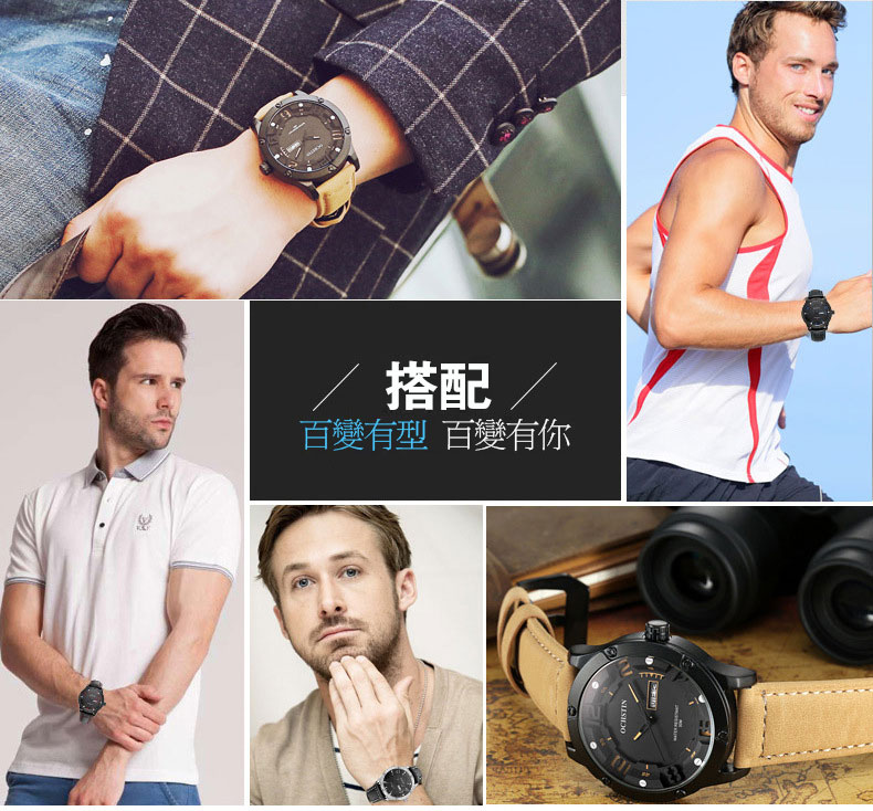 雙日曆流行石英腕表男士運動防水錶Wat30