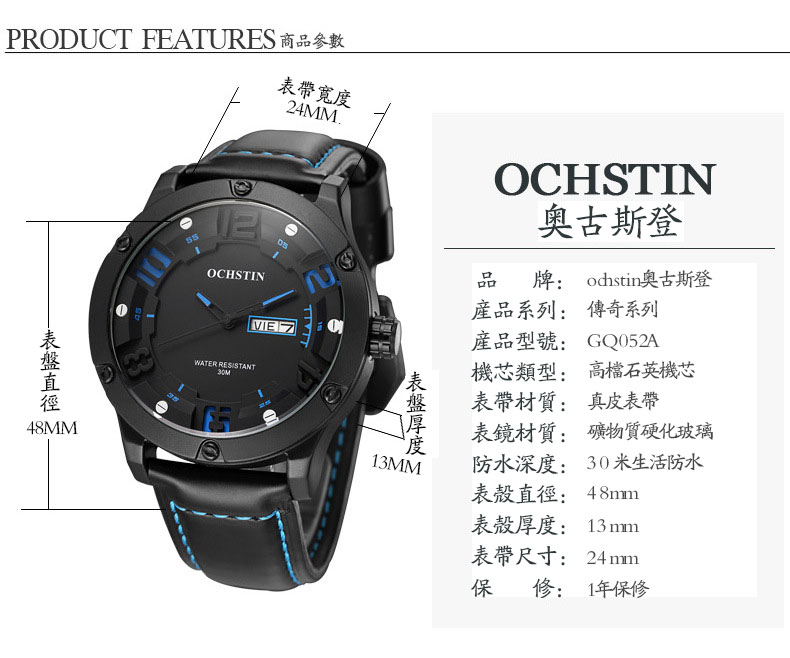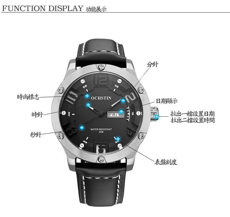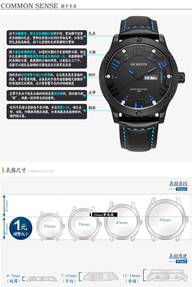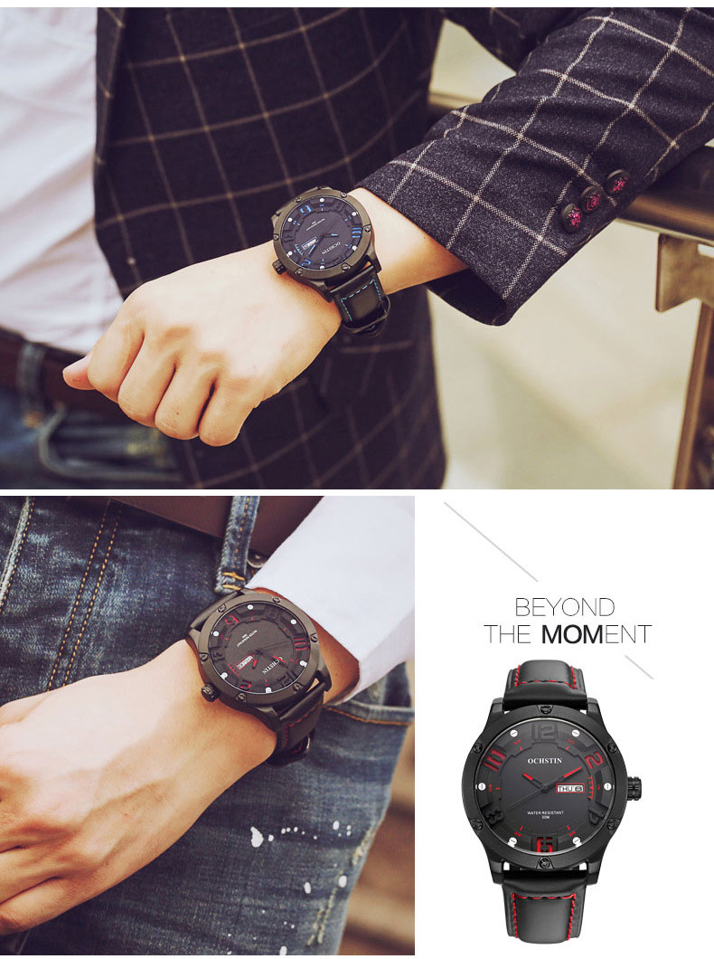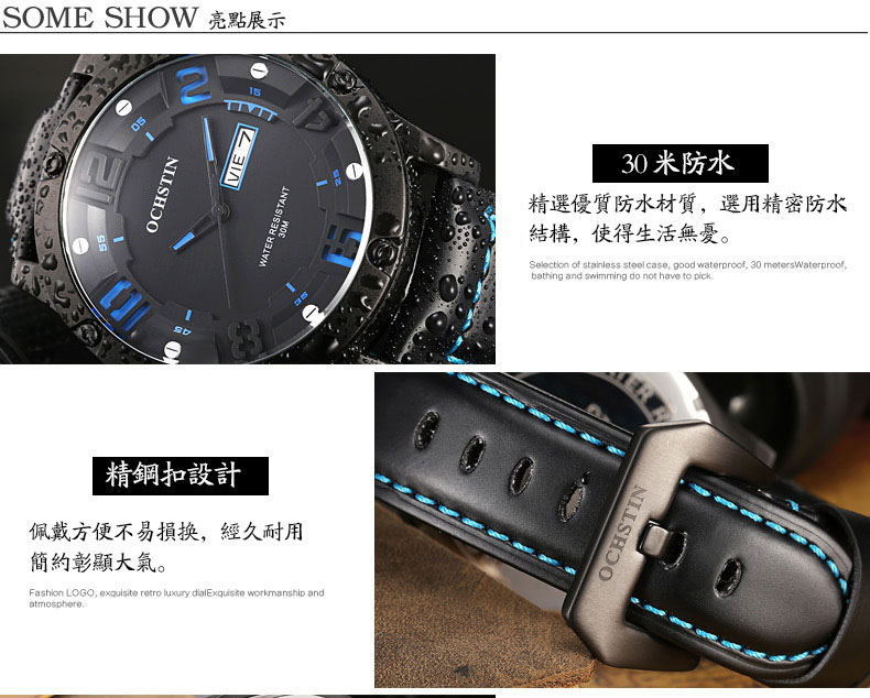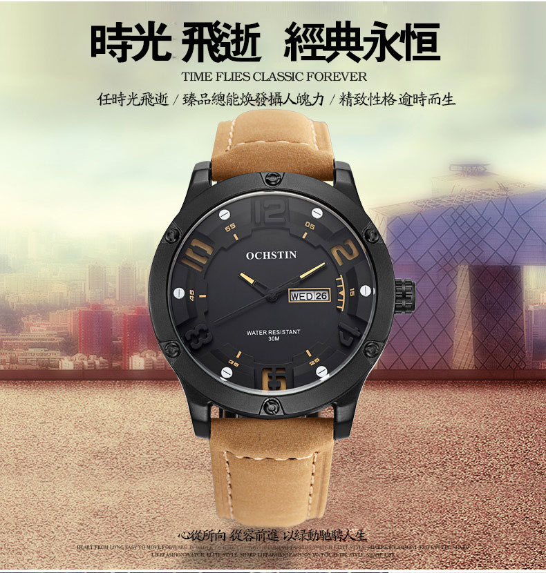 雙日曆流行石英腕表男士運動防水錶Wat30
