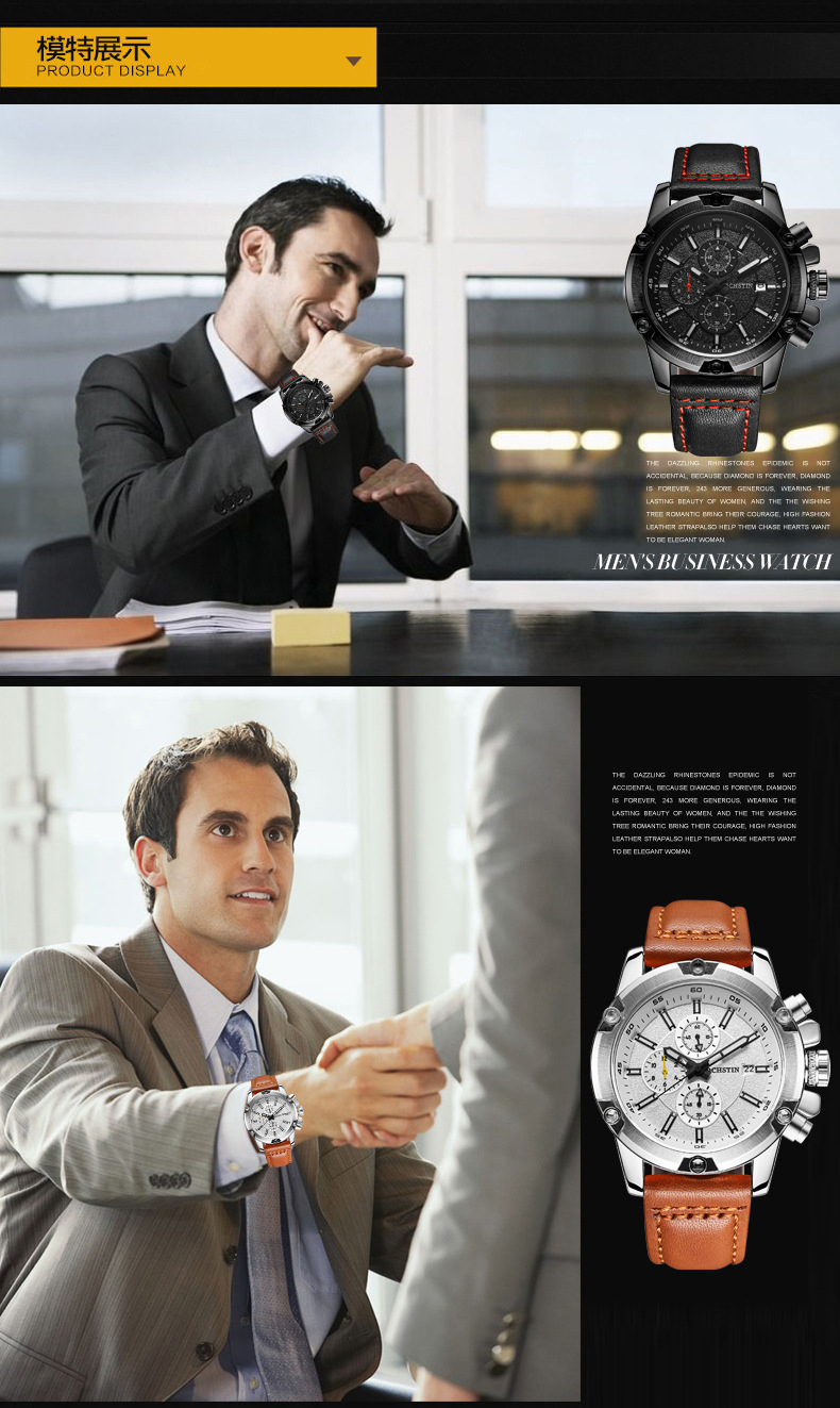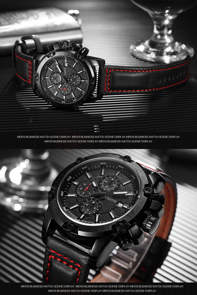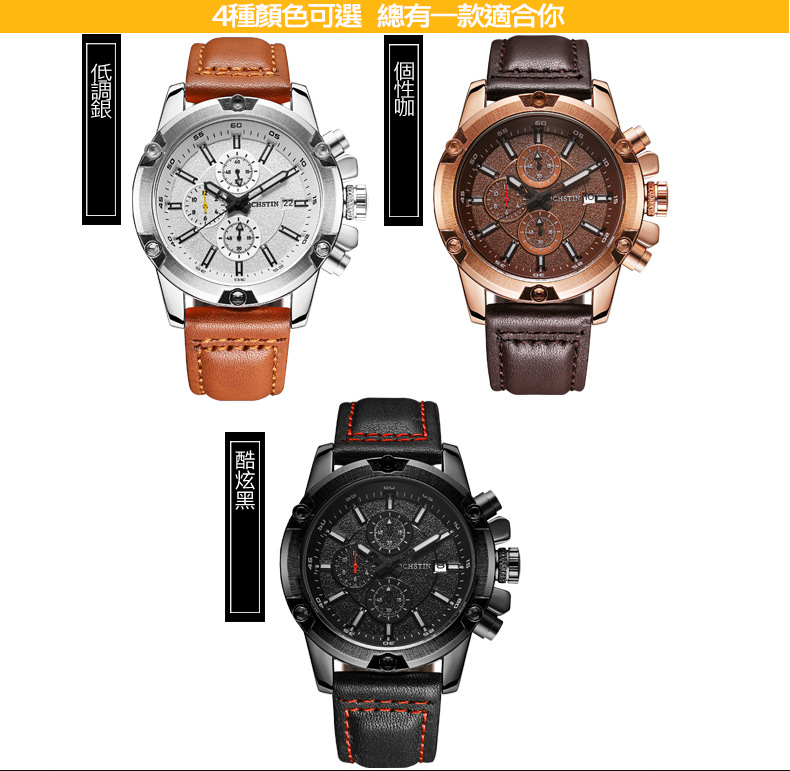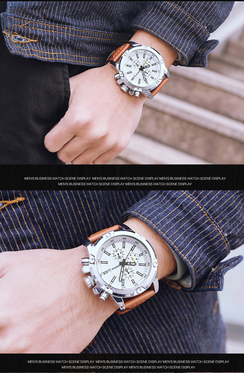 石英日曆腕表真皮男士六針運動防水錶Wat29