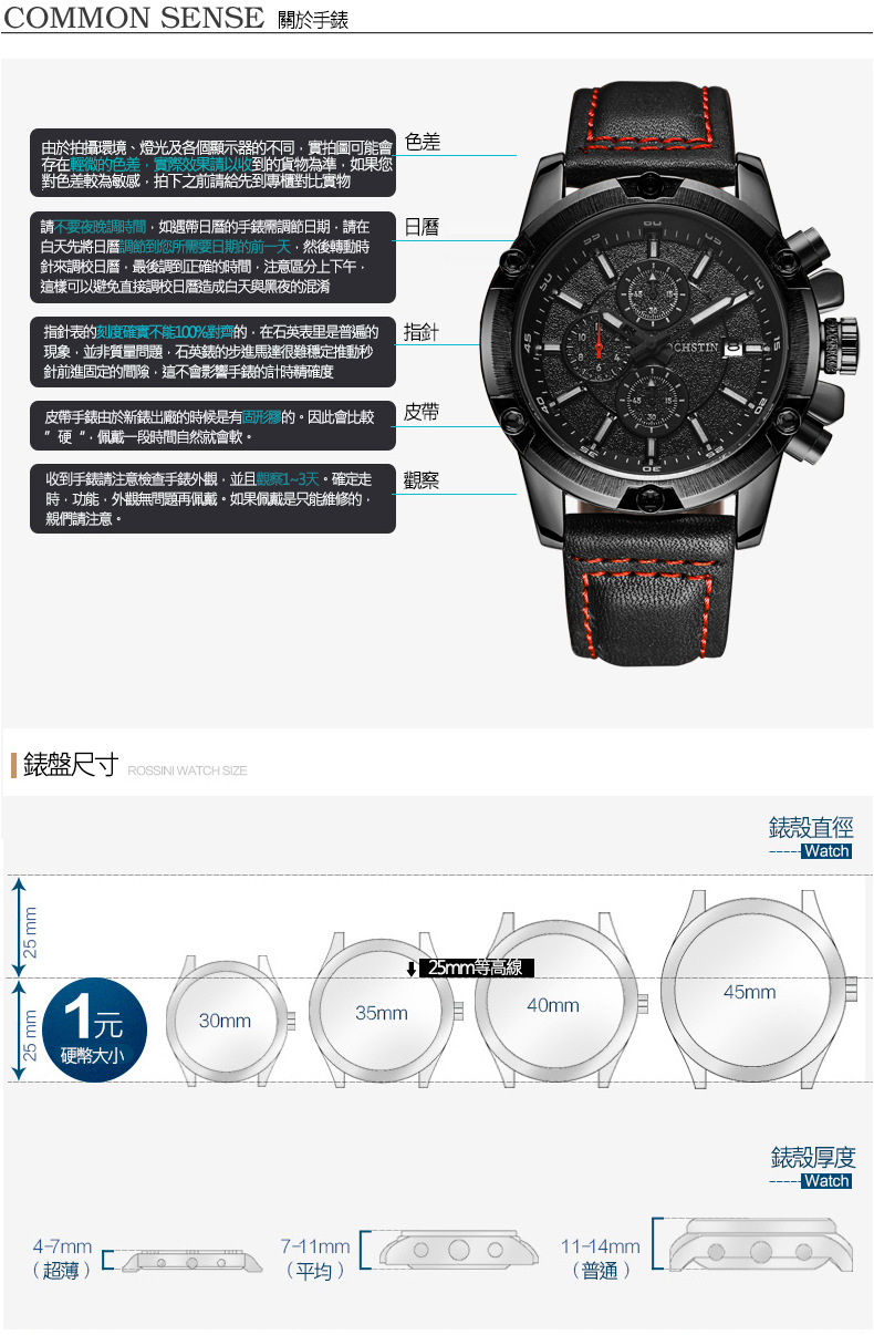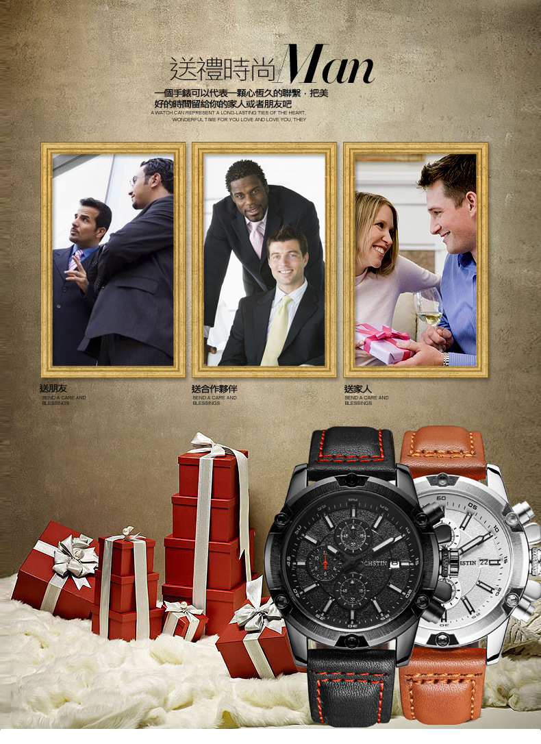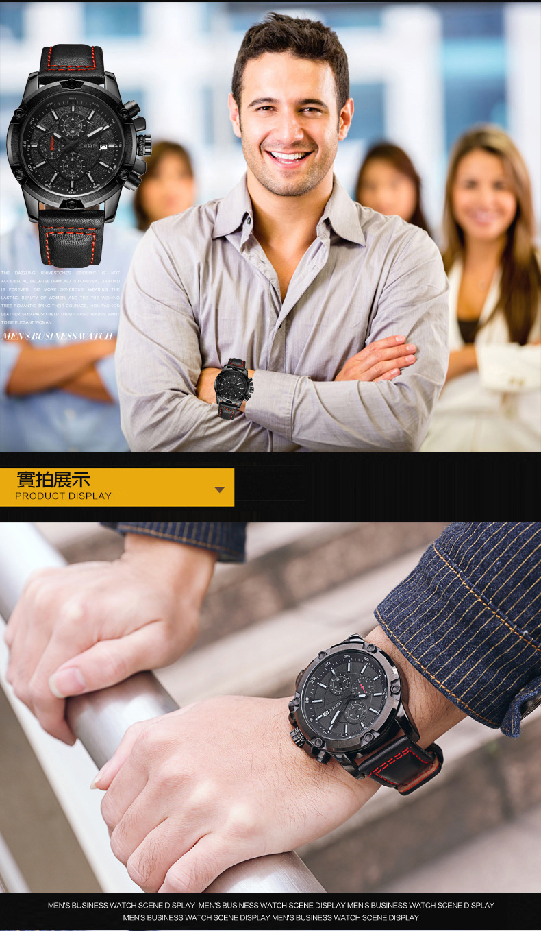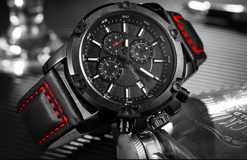 石英日曆腕表真皮男士六針運動防水錶Wat29